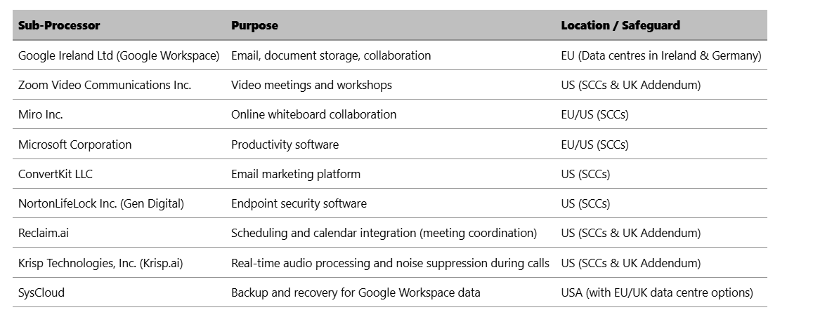 These providers deliver secure cloud-based services and are bound by GDPR-compliant Data Processing Agreements (DPAs) and Standard Contractual Clauses (SCCs) where applicable.